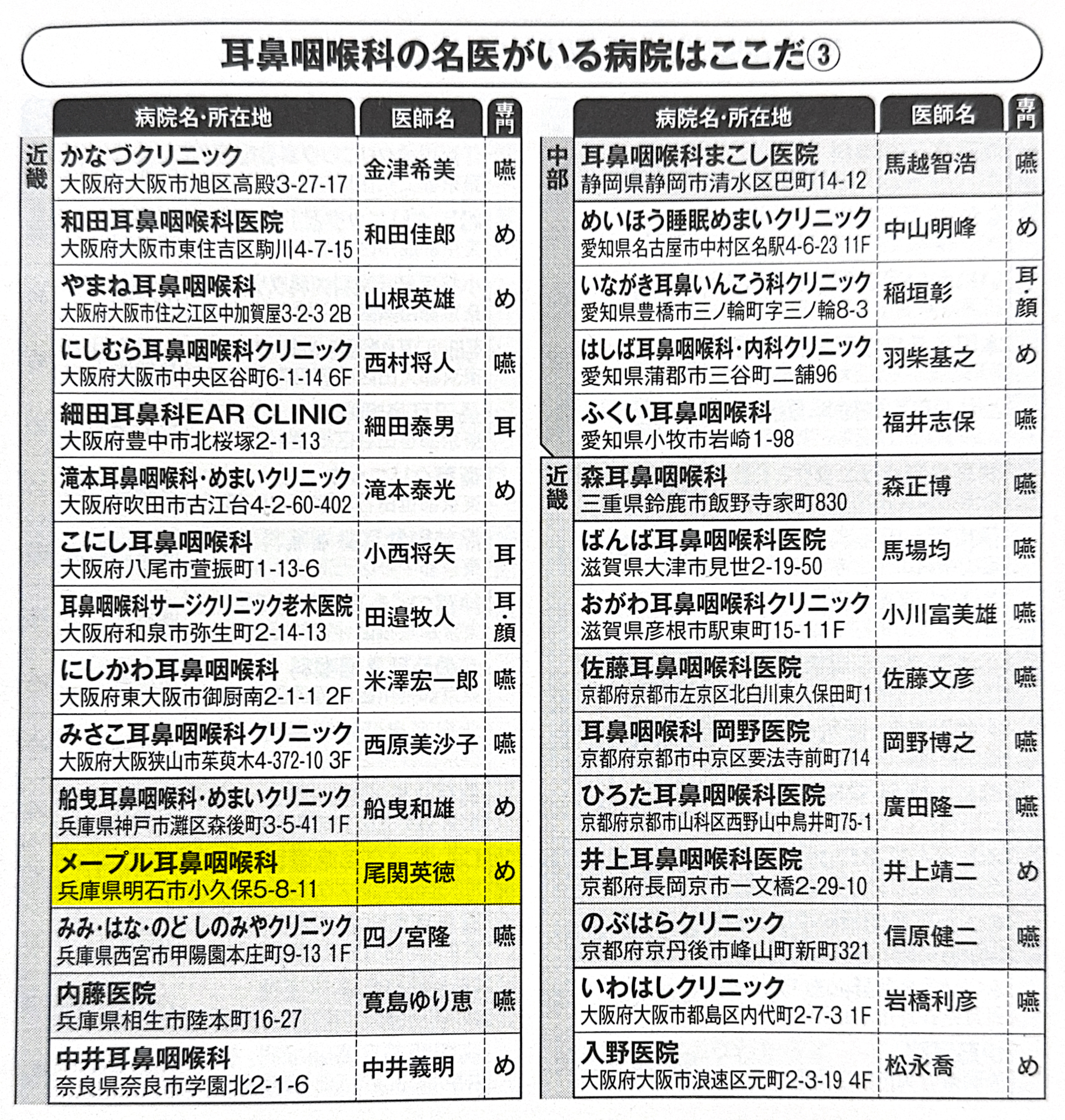 特集「最高の病院&クリニック 耳鼻咽喉科の名医がいる病院はここだ」として紹介されています。