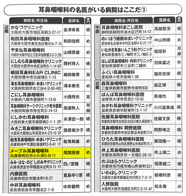 特集「最高の病院&クリニック 耳鼻咽喉科の名医がいる病院はここだ」として紹介されています。